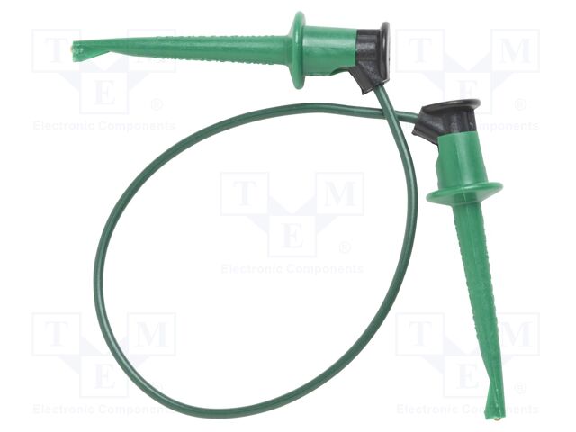 - Price For: Each Contact Material: Beryllium Copper Overall Length: 29.12" Operating Voltage Max: 300VDC Operating Current Max: 5A Cable Length: 24" Connector Type A: Minigrabber Clip Insulator Color: Green RoHS Compliant: Yes