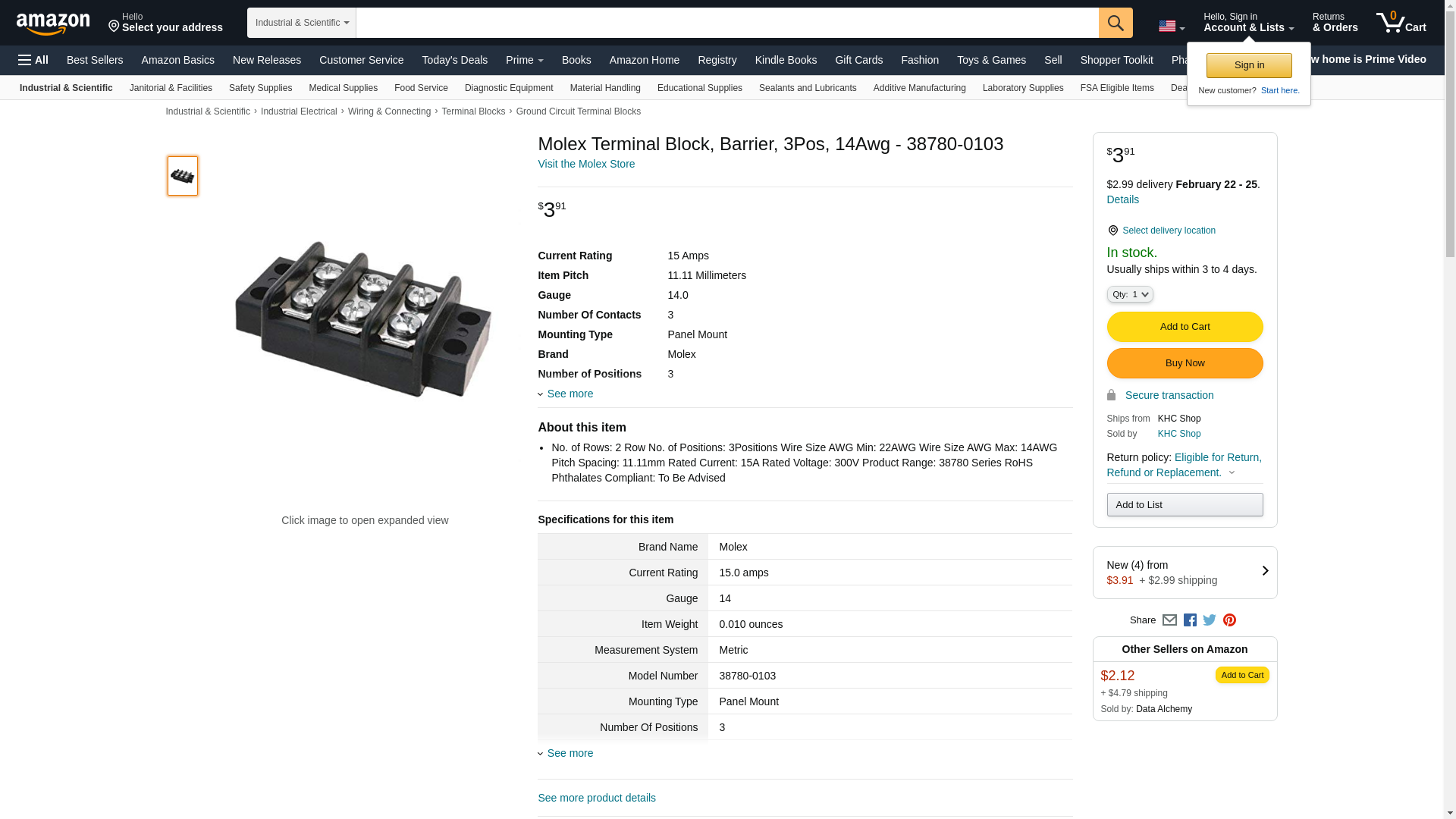 | Waldom | MOLEX 38780-0103 | 20 | 170 | 1 | 20 @ $3.25, 100 @ $2.73 |