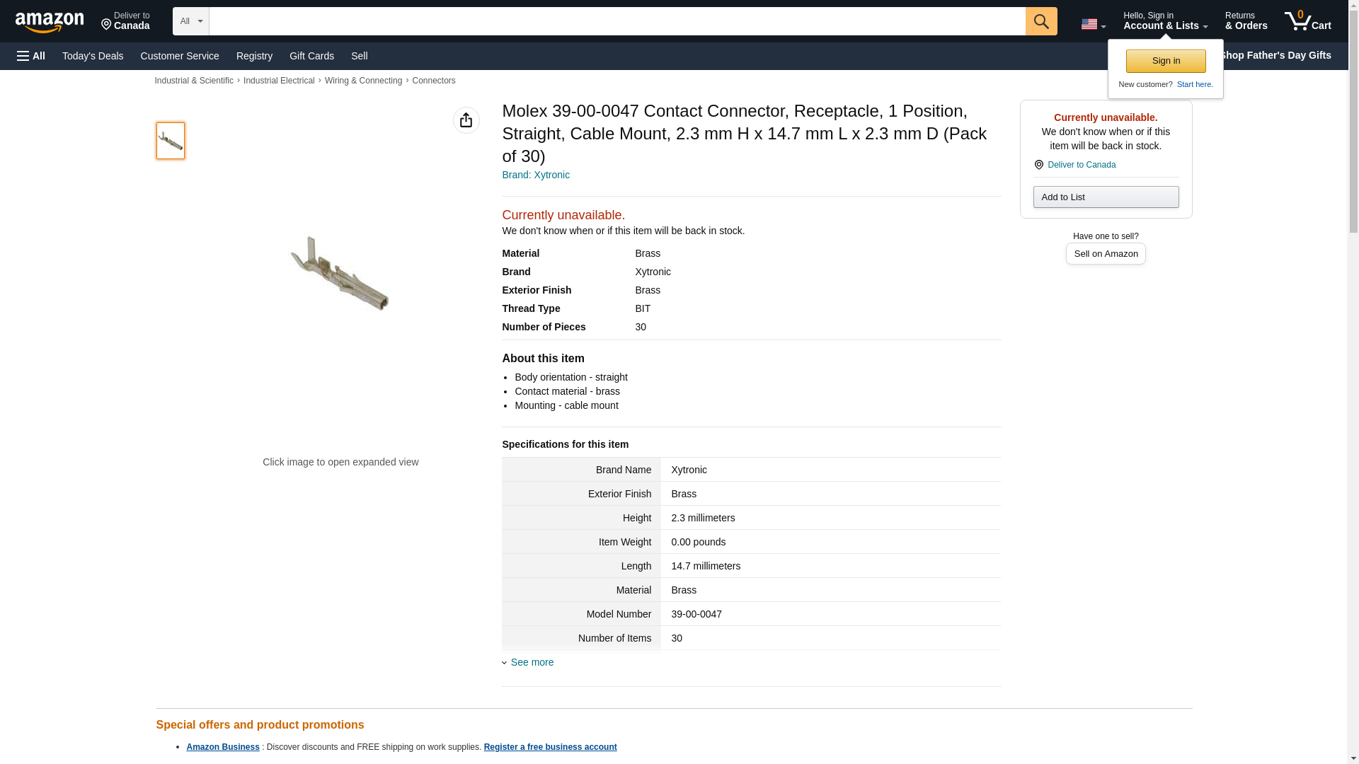Molex 39-00-0047 Contact Connector, Receptacle, 1 Position, Straight, Cable Mount, 2.3 mm H x 14.7 mm L x 2.3 mm D (Pack of 30)