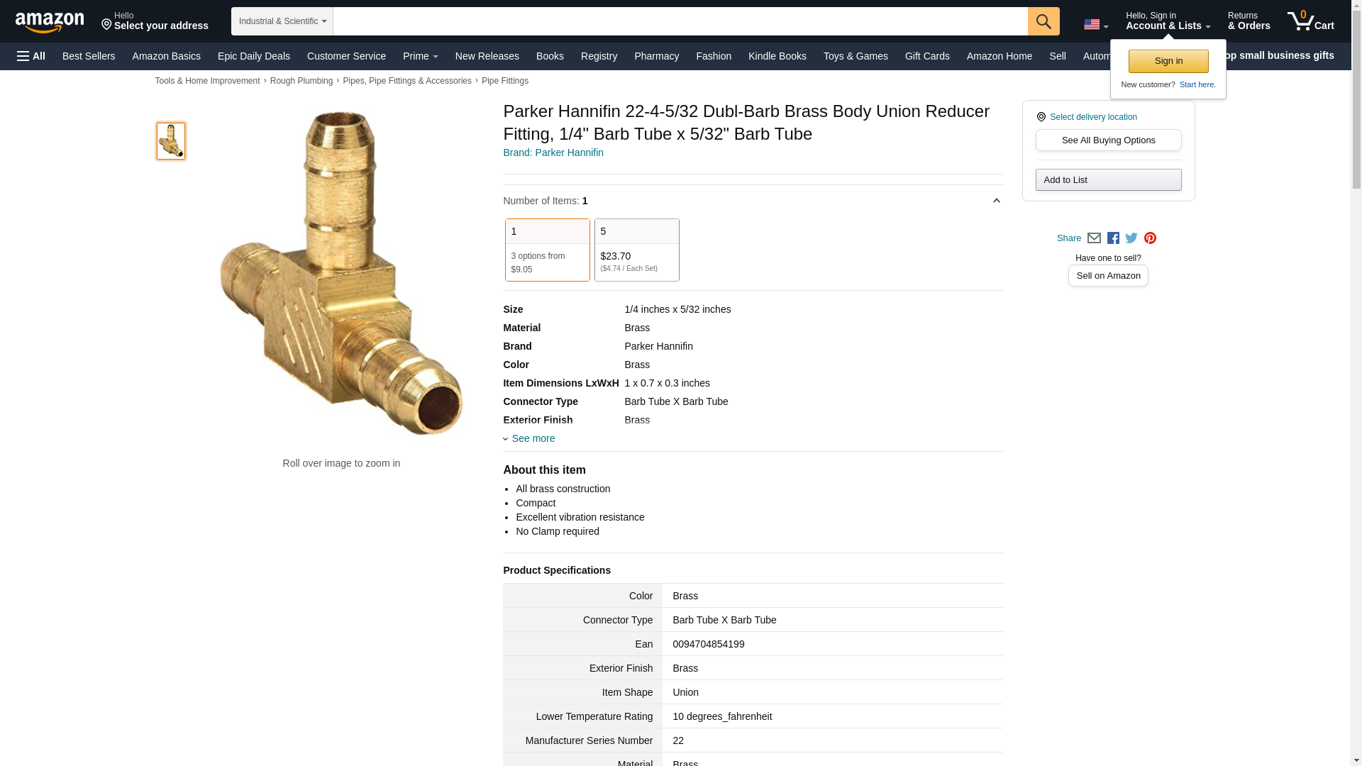 Parker Hannifin 22-4-5/32 Dubl-Barb Brass Body Union Reducer Fitting, 1/4" Barb Tube x 5/32" Barb Tube