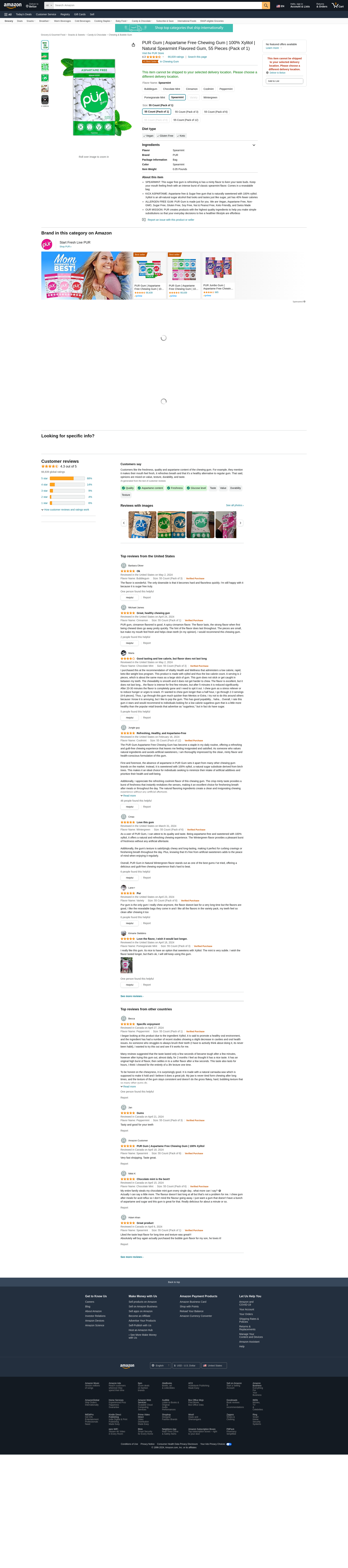 PUR 100% Xylitol Chewing Gum, Spearmint - Sugar-Free + Aspartame Free, Vegan + non GMO, 55 Count (Pack of 1): Maxedbuy.com