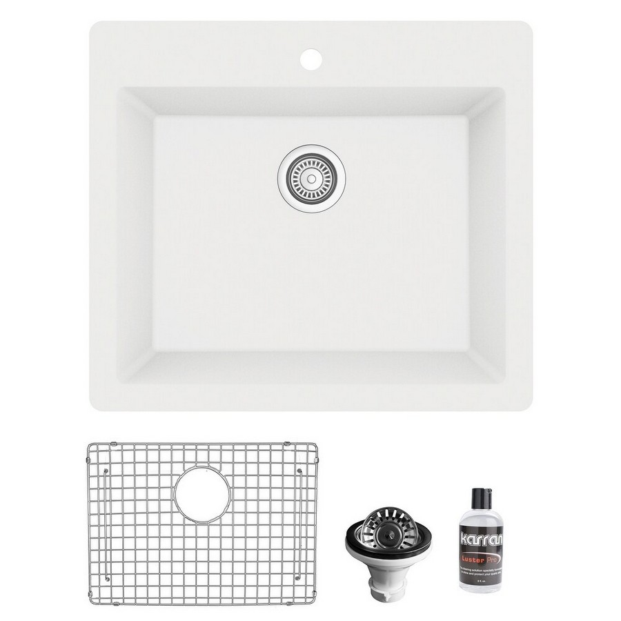 KARRAN QT-820-WH-PK1 QUARTZ QT 25 INCH TOP MOUNT SINGLE BOWL QUARTZ KITCHEN SINK KIT, WHITE