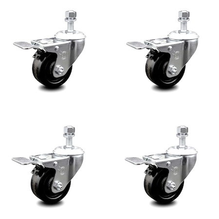 Phenolic Swivel Threaded Stem Caster Set of 4 w/3.5" x 1.25" Black Wheels and 3/8" Stems - Includes 4 with Total Lock Brakes - 1200 lbs Total Capacity - Service Caster Brand