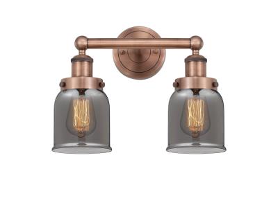 INNOVATIONS 616-2W-AC-G53 Bell 2 15.5 inch Bath Vanity Light Antique Copper. Style: Art Nouveau, Industrial, Restoration-Vintage, Transitional . Collection Name: Edison. Metal Finish(Body): Antique Copper. Metal Finish(Canopy/Backplate): Antique Copper. Material: Steel, Cast Brass, Glass. Dimension(in): 10(H) x 15.5(W) x 7.75(Ext). Bulb: (2)60W Medium Base Incandescent(Not Included). Voltage: 120. Dimmable: Yes. Color Temperature (Kelvin): 2200. Color Rendering Index (CRI): 99.9. Lumens: 220. Life Expectancy (Hours): 2000. Glass Shade Description: Plated Smoke Small Bell. Glass Type: Colorful . Shade Shape: Bell/Urn. Glass or Metal Shade Color: Plated Smoke. Shade Material: Glass. Shade Dimension(in): 5(W) x 5.75(H). Fitter Measurement (Glass Or Metal Shade Fitter Size): 3.25 inch Fitter. Backplate Dimension(in): 4.5(W) x 0.75(Depth). ADA Compliant: No. California Proposition 65 Warning Required: Yes. UL/ETL Certification Type: Damp Location.