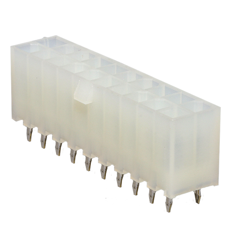 | Feature | Manufacturer: Molex Product Category: Headers & Wire Housings RoHS: Product Type: Header Assemblies Type: Pin Header Series: Pitch: 4.2 mm Number of Positions / Contacts: 20 Number of Rows: 2 Contact Gender: Pin (Male) Contact Plating: Tin Housing Material: Nylon Termination Style: Through Hole Mounting Style: - Mounting Angle: Vertical Contact Material: Brass |