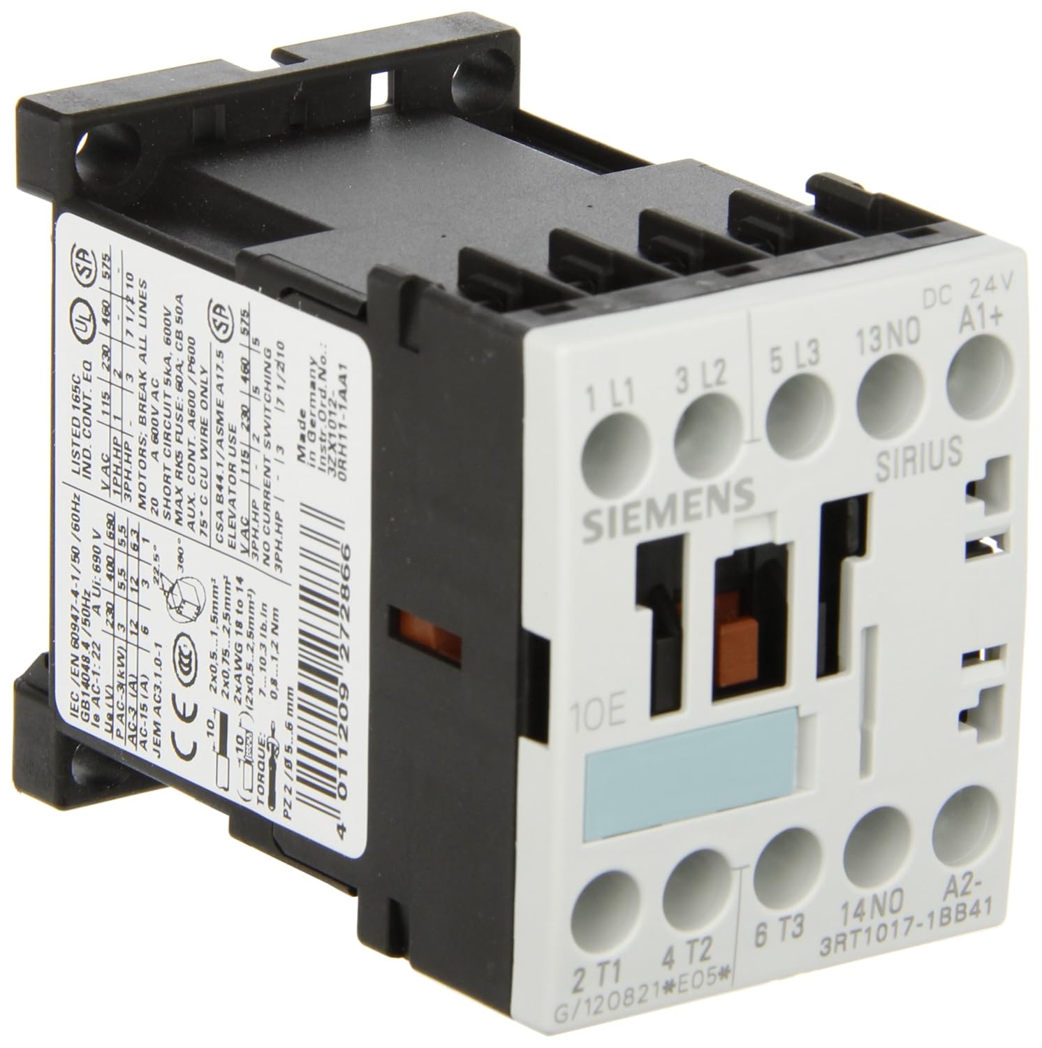 3RT1017-1BB41 Magnetic Contactor; Number of Poles 3; Power Rating/Voltage 13 Kilowatt at 400 Volt (AC-1), 5.5 Kilowatt at 400 Volt (AC-2), 5.5 Kilowatt at 400/500/690 Volt (AC-3); Current Rating 20 Amp (AC-1), 12 Amp (AC-3); Coil Voltage 24 Volt DC; Auxiliary Contact 1NO; Mounting 35 Millimeter Standard Rail, Screw/Snap-On; Enclosure IP20; Size S00; Construction Standard IEC; Approval UL, CSA, CE, EAC, CCC; Main Contact Rating 3NO; Overall Dimension 45 Millimeter Width x 72 Millimeter Depth x 57.5 Millimeter Height; Terminal Type Screw; Ambient Temperature Rating -25 to 60 Deg C; Applicable Standard DIN EN 50022