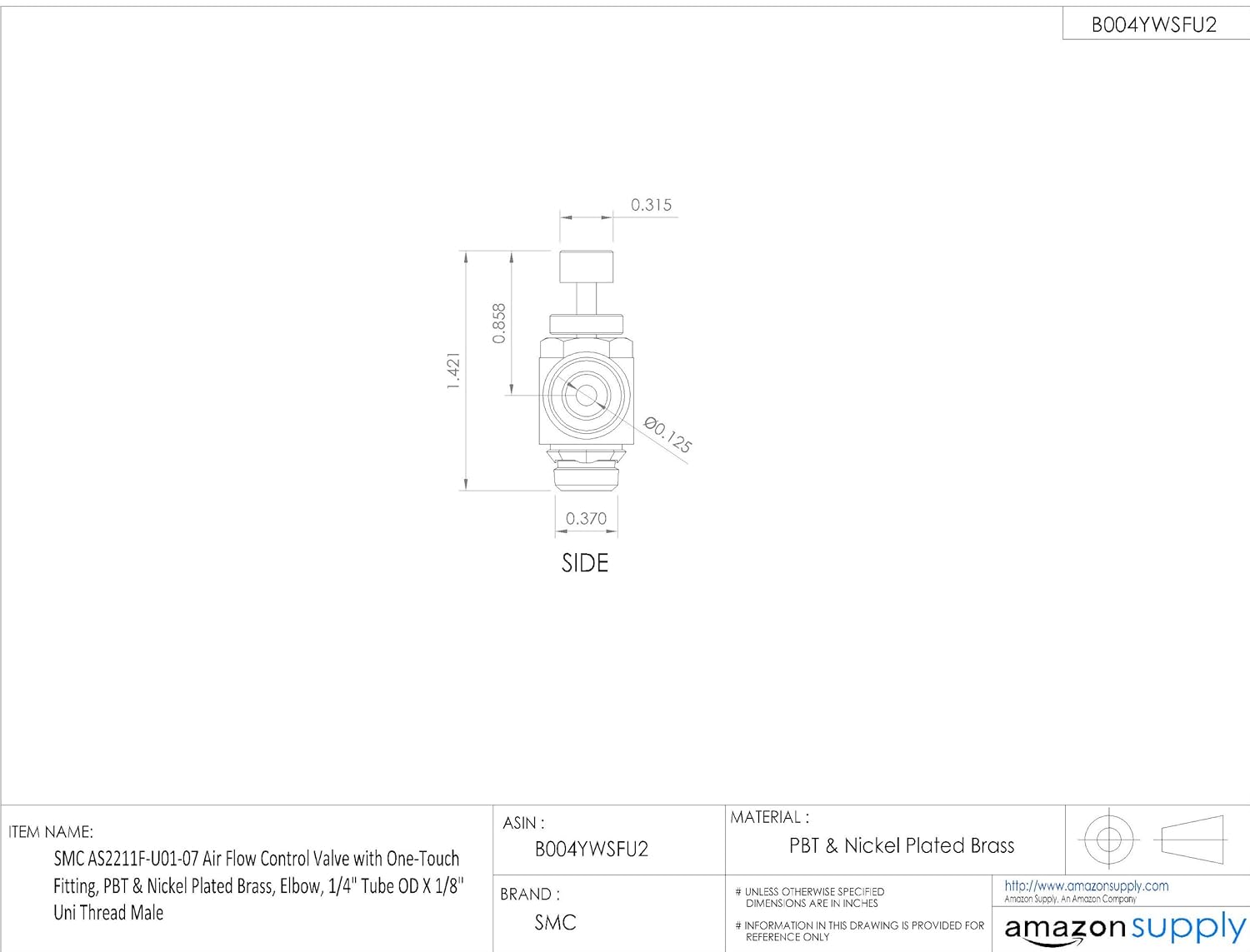 SMC AS2211F-U01-07 Air Flow Control Valve with Push-to-Connect Fitting, PBT & Nickel Plated Brass, Elbow, 1/4" Tube OD x 1/8" Uni Thread Male