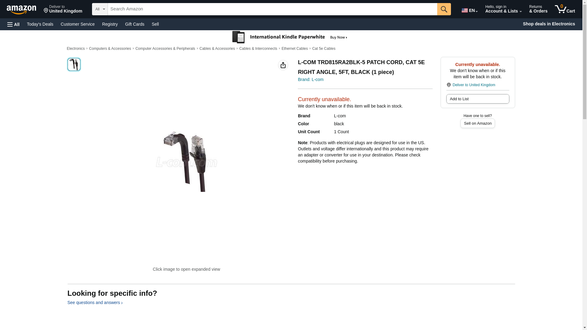 L-Com Patch Cord, Cat 5E Right Angle, 5Ft, Black - TRD815RA2BLK-5