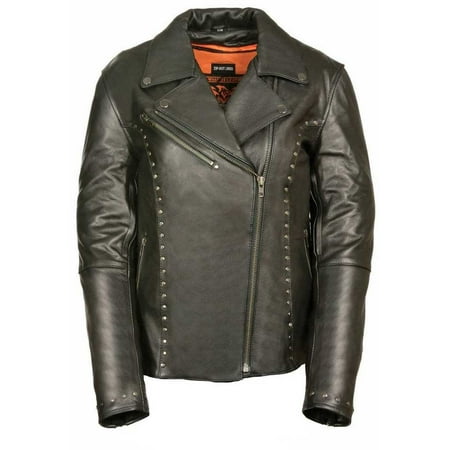 Women's Classic Motorcycle Jacket with Rivet Detailing. Made of Butter Soft Naked Cowhide 1.2-1.3mm with Full Sleeve Zip Out Thermal Liner. Studded Detailing on Arms, Chest, Back & Wrist. Arm & Back Air Vents w/ Full Action Back. Side Zipper Detailing for Comfort Riding. Built-in Dual Side Concealed Weapon & Ammo Pocket. Made to the best quality standards of Milwaukee Leather. <b>As designed, this style jacket is a tighter fit. If you prefer a looser fit, we recommend to order one size larger.</b> <p></p> <ul> <li>Butter Soft Naked Cowhide 1.2-1.3mm with Full Sleeve Zip Out Thermal Liner</li> <li>Stud Detailing on Arms, Chest, Back & Wrist</li> <li>Arm & Back Air Vents with Full Action Back</li> <li>Side Zipper Detailing for Comfort Riding</li> <li>Built-in Dual Side Concealed Weapon & Ammo Pocket</li> </ul>