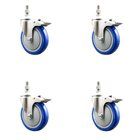 5 Inch 316SS Blue Polyurethane Wheel Swivel 10mm Stem Caster Set Lock Brake