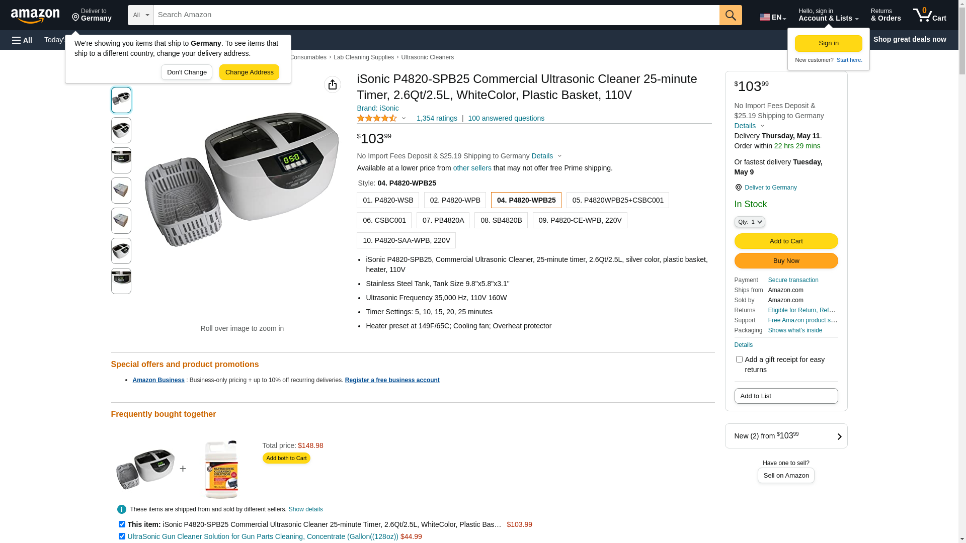 - iSonic P4820-SPB25, Commercial Ultrasonic Cleaner, 25-minute timer, 2.6Qt/2.5L, silver color, plastic basket, heater, 110V