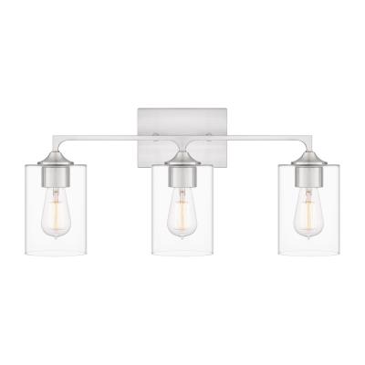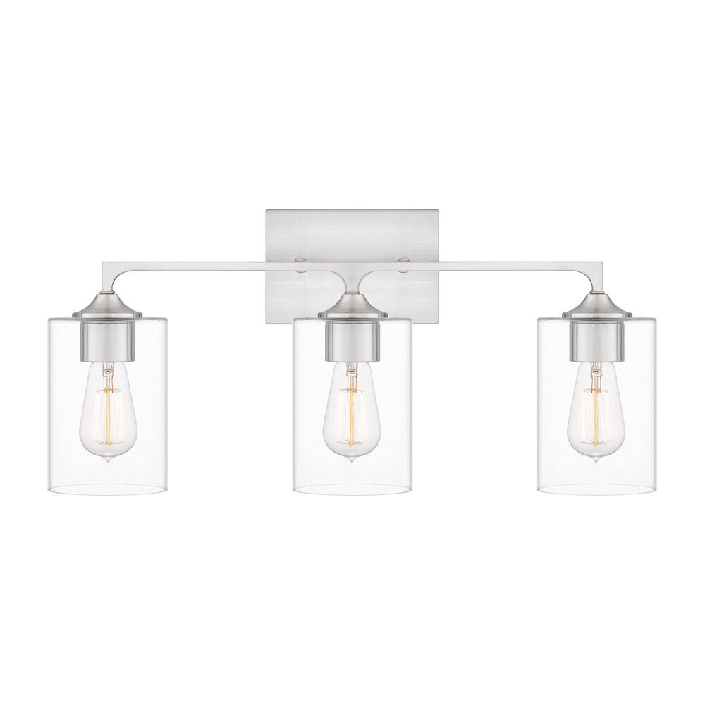 The Prescott bath light offers eye-catching, transitional styling over any bathroom vanity. A simple silhouette and clear cylindrical glass shades make Prescott the perfect choice for understated style. Choose from two, three, or four lights - all available in either brushed nickel or matte black. Three Light Bath from the Prescott collection in Brushed Nickel finish