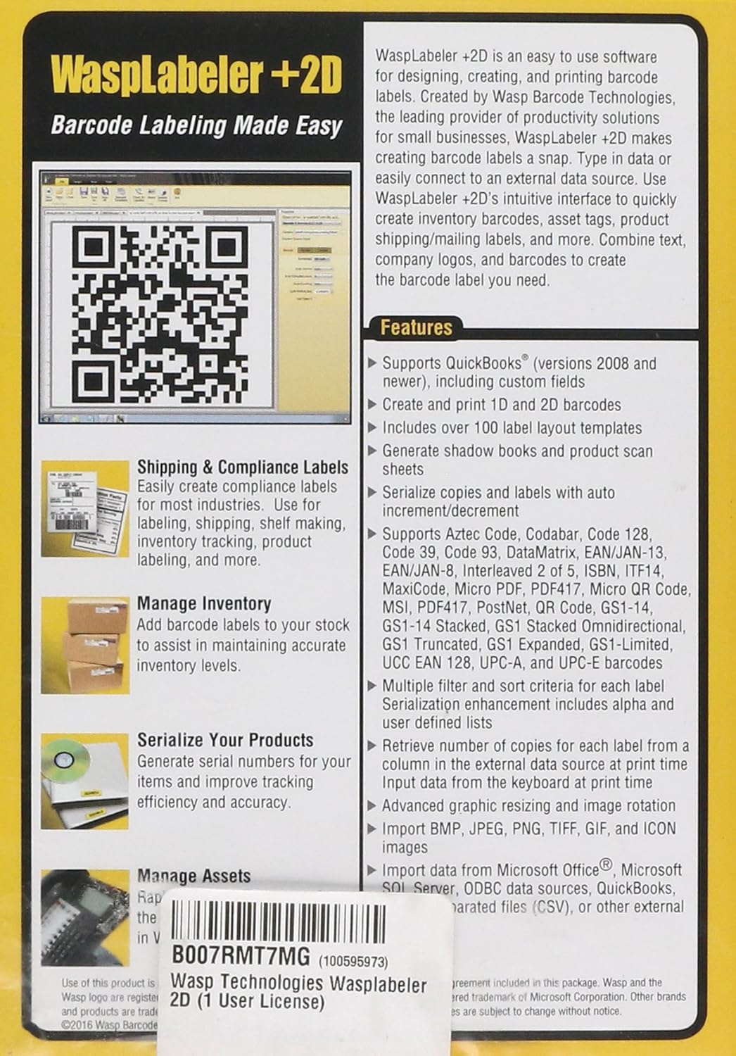 wasplabeler +2d - Barcode Label Design Softwarewasplabeler +2d Is An Easy To Use Solution For Designing, Creating, And Printing Barcode Labels. Select From More Than 100 Pre-designed Label Templates, Build A Custom Label, Or Start From Scratch On Your Own Design. Manually Input Or Easily Connect To An External Data Source, Including Microsoft Excel, Microsoft Access, Or Quickbooks To Obtain Your Label Data. Simply Print Your Labels To Any Networked Windows Printer, For Improved Tracking Efficiency And Accuracy.