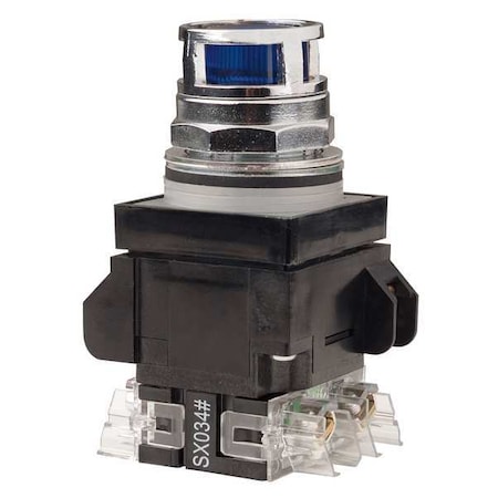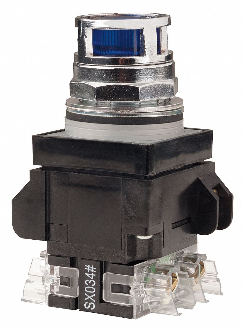 Illuminated Push Button 30mm Maintained / Momentary Type of Operator Round Extended Guarded Button Basic Material Metal Plastic Head Material 1NO/1NC Contact Form Chrome Plated Bezel Color Blue Lamp Module Voltage 6VAC/DC Lamp Module Type Full Voltage Lamp Type LED Lamp Voltage 6VAC Contact Rating 10A @ 600VAC/DC Number of Operators 1 NEMA Rating 1 3 3R 4 4X 12 13 IP Rating 10 Standards UL cUL CSA Terminal Connection Pressure Plate
