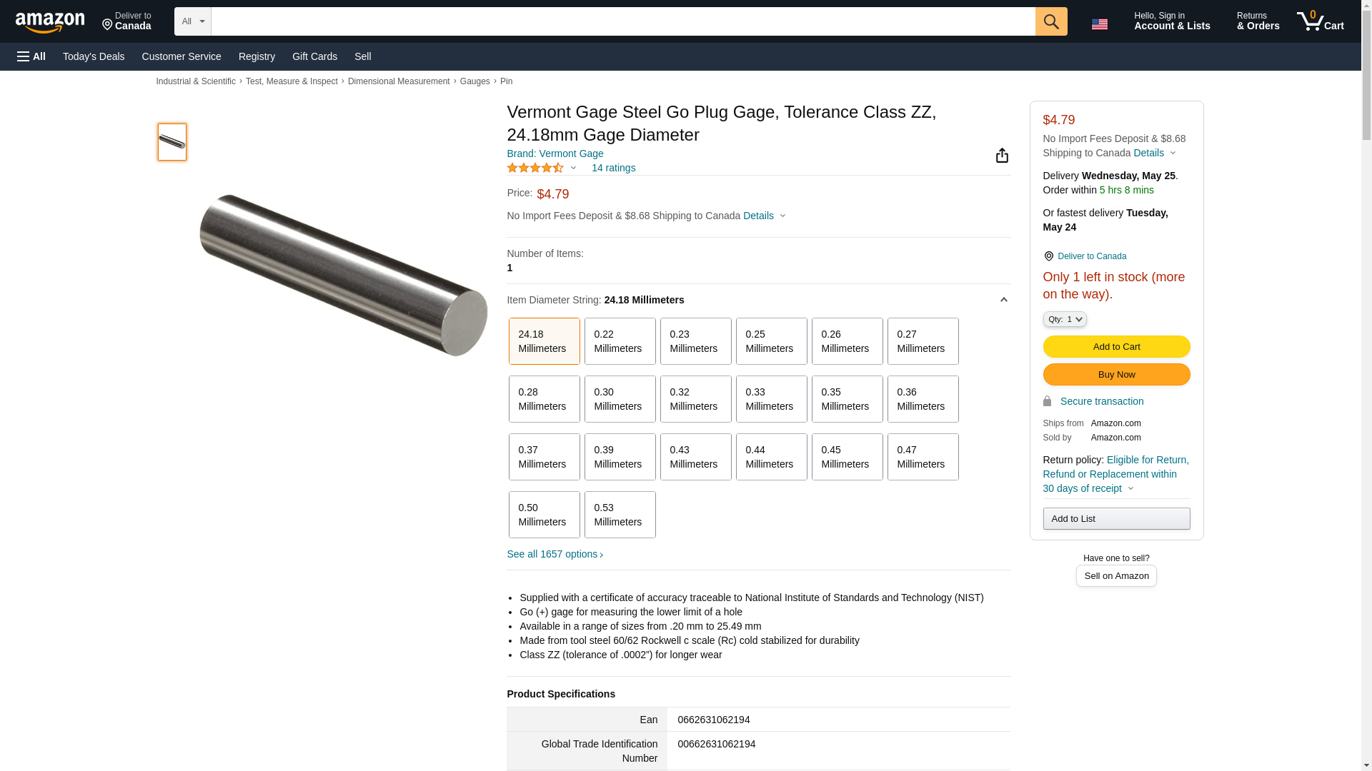 Vermont Gage Steel Go Plug Gage, Tolerance Class ZZ, 24.18mm Gage Diameter