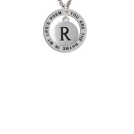Capital Letter - R - Pebble Disc - You Are The Rhyme To My Life's Poem Affirmation Ring Necklace. Charm. Charm size is approx. 0.59 x 0.50 x 0.09 inches (HxWxD) including loop. Silver tone 2mm Belcher Chain Necklace is approx. 24 Inches with a Lobster Claw Clasp. Affirmation Ring is approx. 0.86 x 0.86 x 0.05 (HxWxD). This inspirational piece of jewelry is very meaningful. Its circular shape is symbolic for endless belief in the message that is imprinted around the ring. These are motivational or sentimental messages to the wearer. Makes a great gift! PLEASE NOTE: Our products are lead safe, but are not intended for children 14 years and younger.