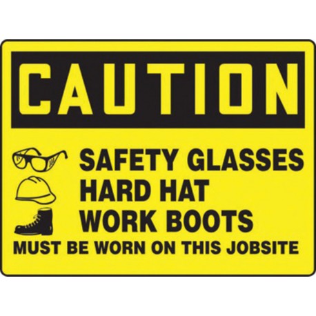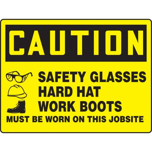 Accuform MPPE775VP Plastic Safety BIGSign, Caution Safety Glasses Hard HAT Work Boots Must BE Worn ON This JOBSITE" with Graphics, 18" Length x 24" Width x 0.055" Thickness, Black on Yellow