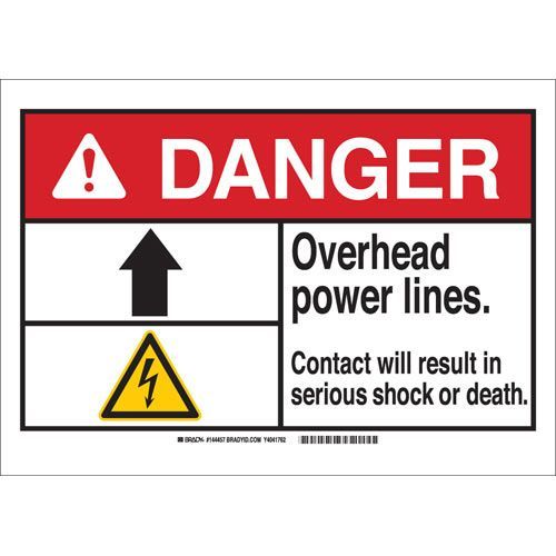 Brady 144452 DANGER Overhead Power Lines. Contact Will Result In Serious Shock Or Death. Sign - Non-reflective Aluminum - Black/Red/Yellow on White - 10 x 14