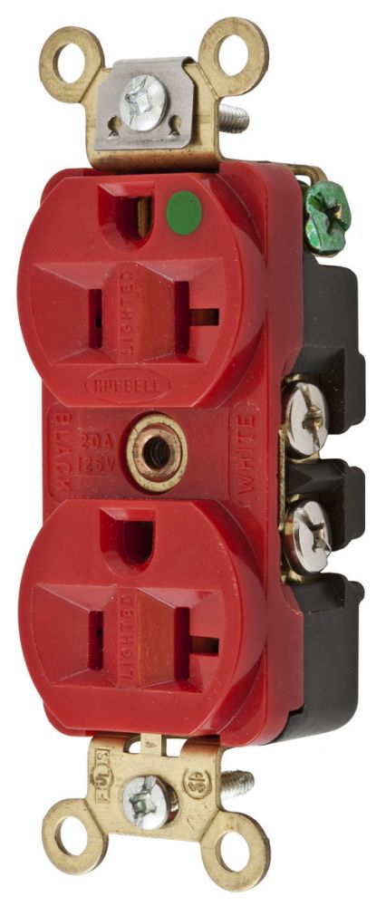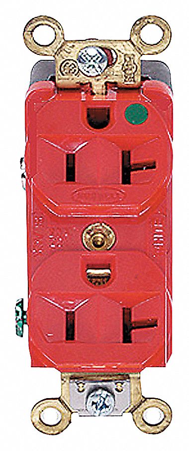 This hospital grade receptacle is designed to withstand the severe conditions of abuse that are unique to hospital environments. Built with nickel-plated bypass contacts that increase contact pressure and help lower operating temperature. The four-point grounding system provides redundant grounding for low resistance ground continuity, and thermoplastic polyester (RTP) back is tough and heat-resistant. To quality for the hospital grade designation and use of the green dot symbol, UL requires product performance to specific levels. These levels form an established baseline below which no manufacturer can fall and still carry a green dot.<br /><br /> Item: Receptacle<br /> Type - Plugs and Receptacles: Straight Blade<br /> Application Environment: Heavy Use Hospital Grade<br /> Amps - Plugs and Receptacles: 20<br /> NEMA Receptacle Configuration - Plugs and Receptacles: 5-20R<br /> Voltage - Plugs and Receptacles: 125VAC<br /> Number of Poles: 2<br /> Number of Wires: 3<br /> Tamper Resistant: No<br /> Weather Resistant - Plugs and Receptacles: No<br /> Outlet Type - Plugs and Receptacles: Standard Duplex<br /> Mounting Type - Plugs and Receptacles: Flush<br /> Color - Plugs and Receptacles: Red<br /> Item - Plugs and Receptacles: Receptacle<br /> Wiring Method - Plugs and Receptacles: Back and Side<br /> Surge Suppression: No<br /> Special Features: Illuminated<br /> Material: Impact Modified PBT/Reinforced PET<br /> Phase: 1<br /> HP: 1.0<br /> IP Rating: 20<br /> Power Indicator: No<br /> Corrosion Resistant: No<br /> Number of Gangs: 1