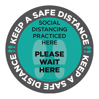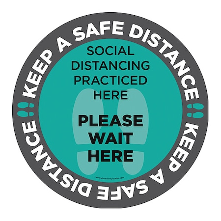 Social Distance Floor Sign, Sign Subject Matter Social Distancing, Height 17 in, Width 17 in, Sign Material Vinyl, Sign Mounting Style Adhesive, Header No Header, Legend Keep A Safe Distance, Social Distancing Practiced Here, Please Wait Here, Printed Language English, Sign Shape Circle