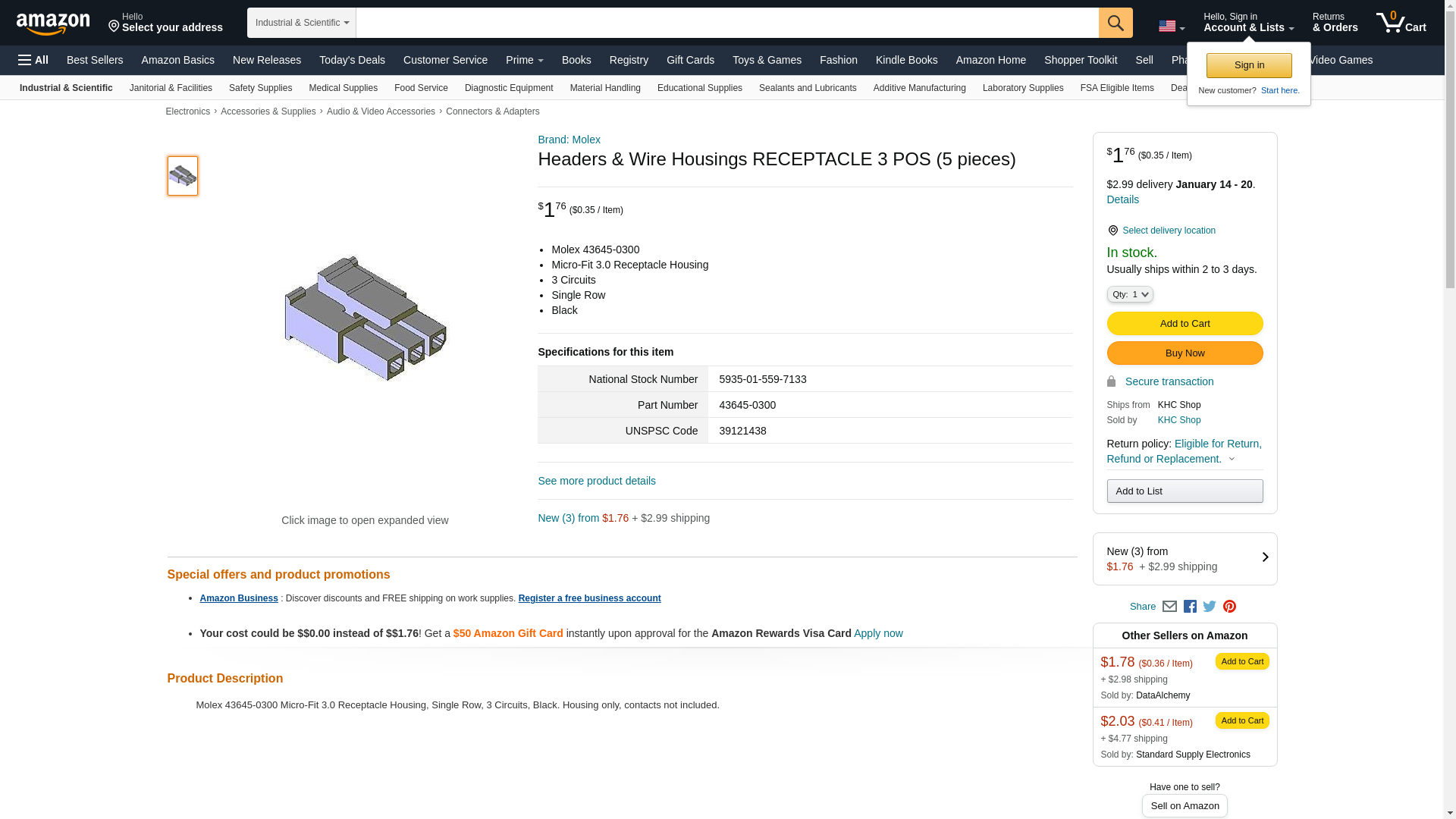 | MX-43645-0300 | 2 | 23627 | 2 | 2 @ $0.82, 10 @ $0.46, 50 @ $0.33, 200 @ $0.26, 1000 @ $0.23 | |