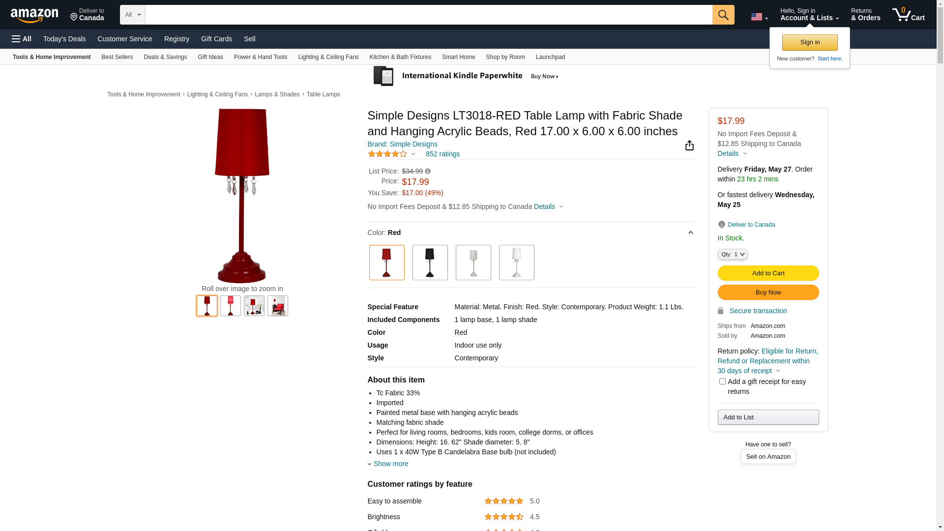 | Feature | This fun and fashionable table lamp, with its painted metal base and fabric shade bejeweled with hanging Acrylic beads, will add style and pizzazz to any room |