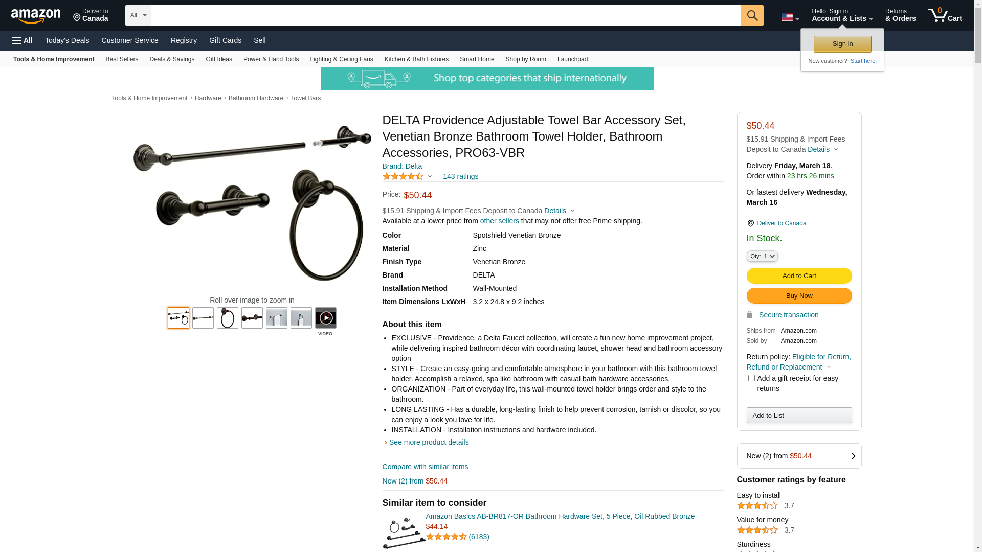 Delta Faucet Bath Accessories PRO63-VBR Providence 3-Piece Bathroom Sets with Adjustable Towel Rack (18