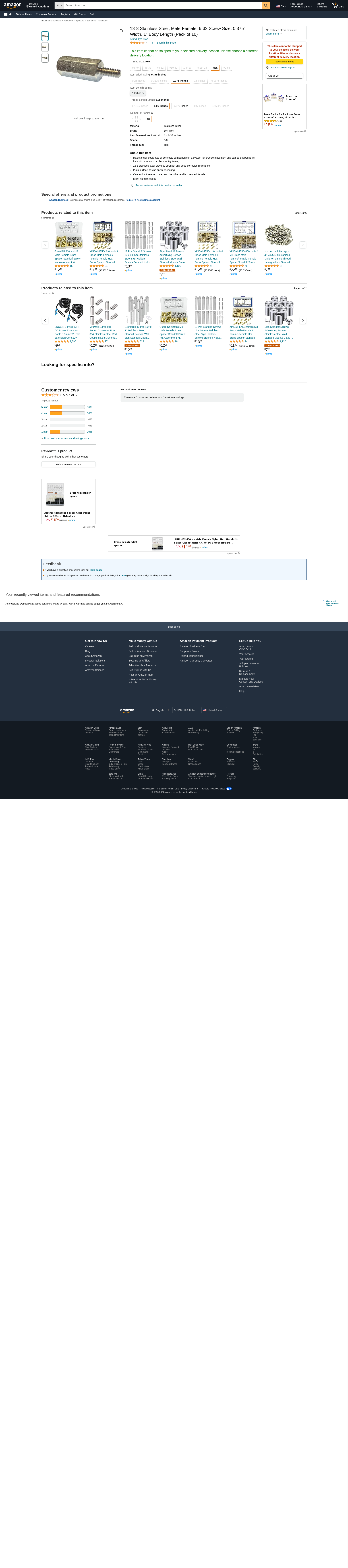 Lyn-Tron, 18-8 Stainless Steel, Male-Female, 6-32 Screw Size, 0.375" Width, 1" Body Length (Pack of 10)