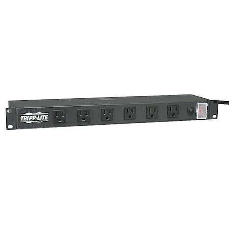 TRIPP LITE 19' rackmount AC power strip. 15 A 125 VAC. 15' power cord, 6 rear and 6 front outlets. On/off switch w/locking switch cover. Ground pin on bottom