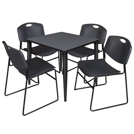 - Versatile table and chair set includes one 30-inch square table with modern black tapered legs and 4 Black Zeng Stack Chairs