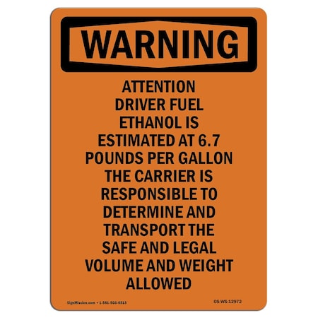OSHA WARNING Sign, Attention Driver Fuel Ethanol, 24in X 18in Decal