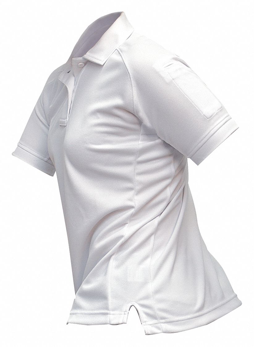 Women's Tactical Polo, Size XL, Color White, Material 100 Percent Polyester, Fits Chest Size 40 In. to 42 In., Sleeve Length Short Sleeve, Closure Type Button, Fabric Polyester, Pockets 2, Binding 4-Hole Melamine Buttons, Fabric Weight 6.5 oz.