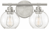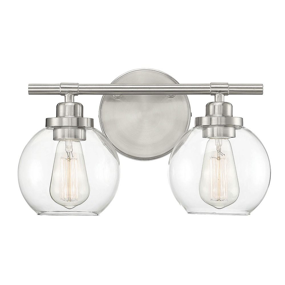 Adding the Savoy House Carson 2-light bath bar easily helps you boost the illumination and the style of any bathroom. Its fishbowl-style clear glass shadesmake a big statement and are open at the bottom, making it easy to replace the bulbs. The streamlined structure offers up subtle detailing with a mid-century modern vibe and the circular backplate echoes the shape of the glass shades. Finished in satin nickel. This fixture is 14" wide and 8.5" tall. It extends 7" from the wall. Uses 2 standard size bulbs of up to 60 watts each (not included).