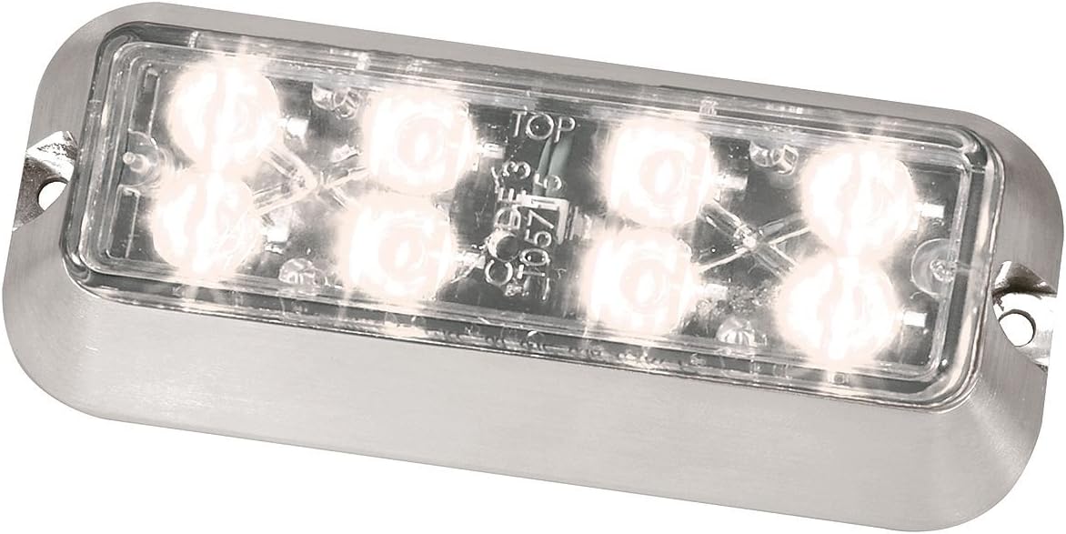 Technical Specification Item Warning Light Wide Range - Vehicle Lighting Perimeter Light Length - Vehicle Lighting 5 Width - Vehicle Lighting 1 Height - Vehicle Lighting 2 Lens Color - Vehicle Lighting White Number of Flash Patterns - Vehicle Lighting 8 Number of Heads 1 Lighting Technology - Vehicle Lighting LED Mounting - Vehicle Lighting Permanent Standards SAE J845 Class II Wiring Connection - Vehicle Lighting Pigtail Voltage - Vehicle Lighting 12VDC Beam Angle - Vehicle Lighting 180 Degrees Flashes per Minute Variable Power Source 12VDC Current Drawn 0.5A Base Material Aluminum Housing Material Aluminum Lens Material Polycarbonate Lens Design Rectangular Features Directional Optic Includes Pigtail This listing is for each.