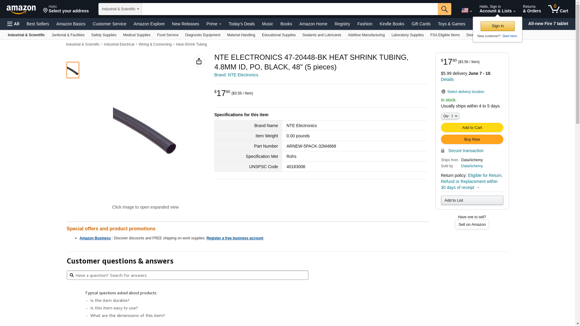 NTE ELECTRONICS 47-20448-BK HEAT SHRINK TUBING, 4.8MM ID, PO, BLACK, 48" (10 pieces)