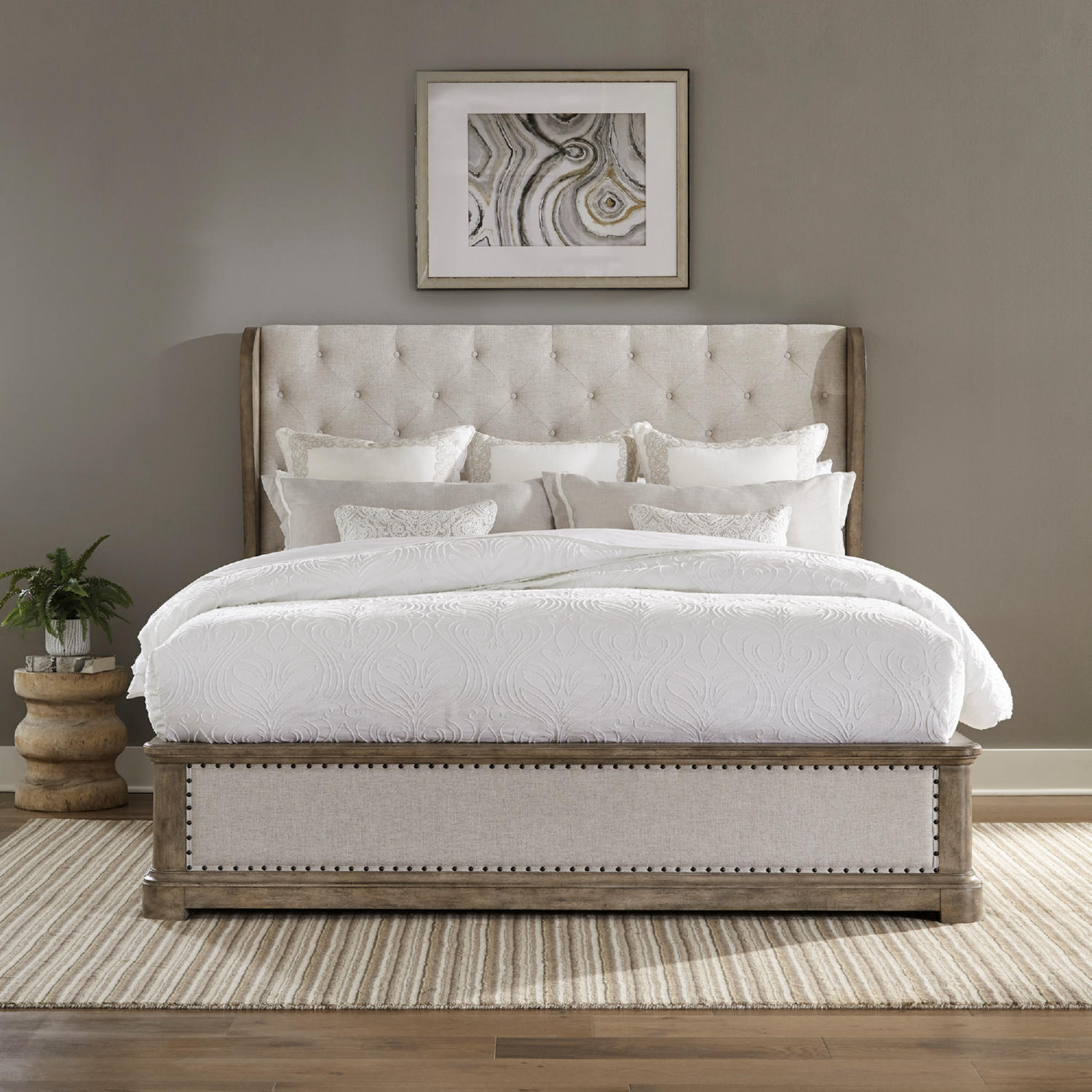 Liberty 711-BR-KSH Town & Country King Shelter Bed in Taupe Wood & Tufted Cream Linen