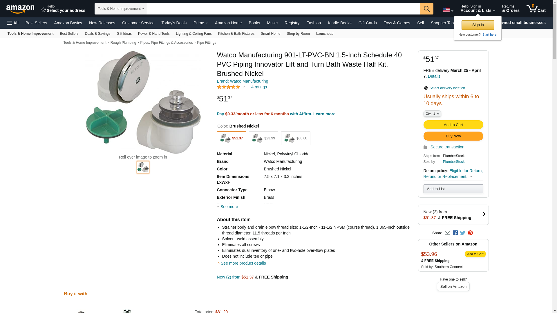 Watco Manufacturing 901-LT-PVC-BN PVC L/T Waste & Overflow BN, Brushed Nickel