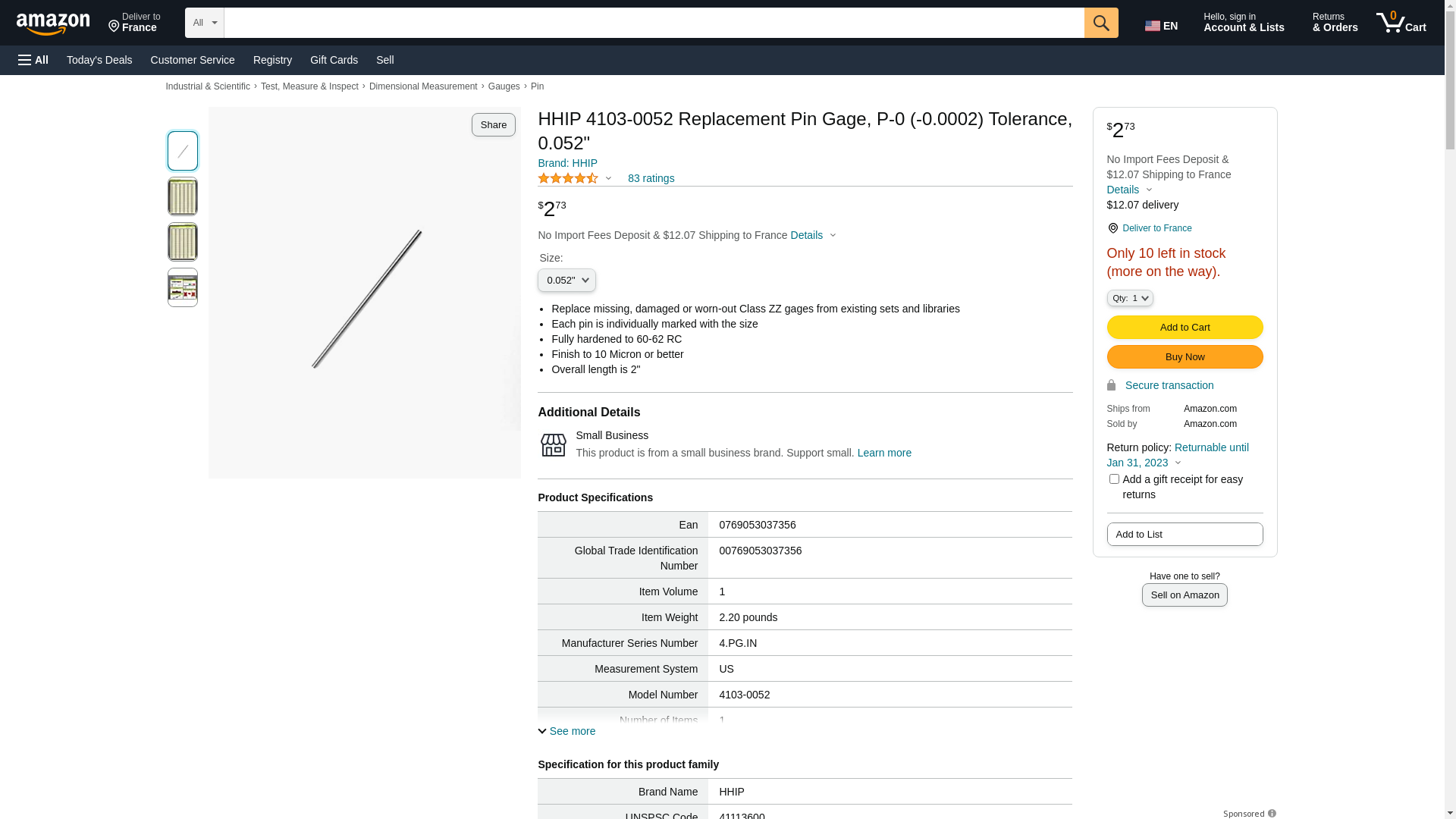 HHIP 4103-0052 Replacement Pin Gage, P-0 (-0.0002) Tolerance, 0.052"