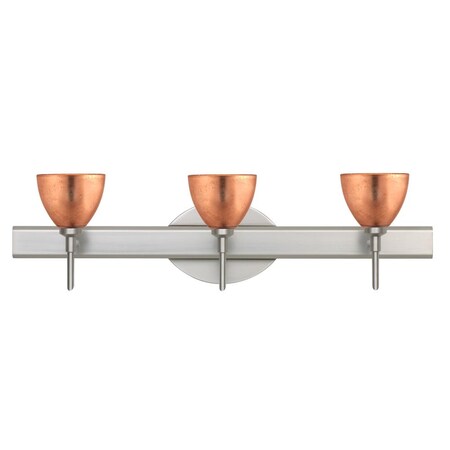 Glass:Copper Foil, Finish:Satin Nickel, Light Bulb:(3)40w T4 G9 120v Halogen Divi 3-light vanity sconce Dimmable with standard incandescent dimmer (not included) Decorative finials can be removed for downlighting applications Decorative outlet box cover optional when not required Installs directly to a 4 octagonal outlet box, with 1.75 left or right offset Orient upward or downward, wall mount only