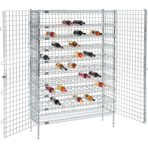 A safer and more secure way to store wine bottles. Open 2" square grid mesh ensures high visibility, while lockable double door (opens a full 270°) keeps contents protected. Security units feature adjustable levelers and assemble easily. Includes 1 door set, 2 standard wire shelves, 2 side panels and back, 4 posts, 8 wine shelves, shelf clips and 4 adjustable leveling feet (with non-marring floor glides) which allow compensation for uneven floors. Chrome plating process consists of electro-plated nickel-chrome resulting in a brilliant high gloss finish. Open Wire truss reinforced shelves feature front to back welded surface ribs for added strength. Open design maximizes air and light circulation and minimizes dust accumulation. Limited one year warranty in dry application and usage. , Lot of 1