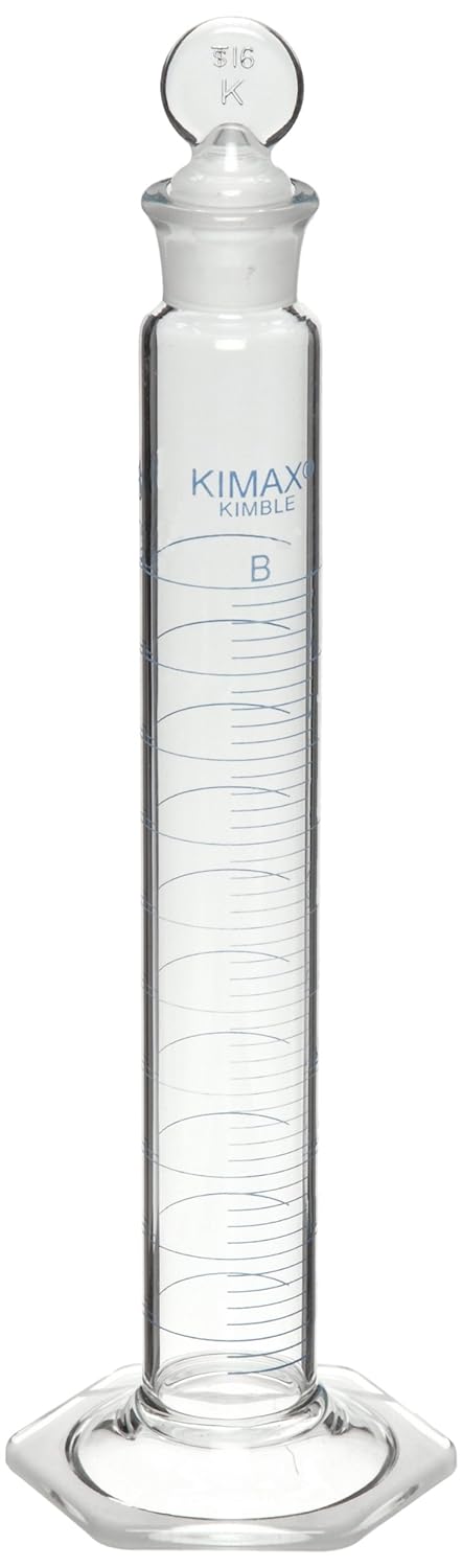 These Kimax cylinders (formerly Exax) have a durable blue ceramic enamel scale. A ground glass joint glass stopper is supplied. Heights given below do not include the stopper. Designed from ASTM Specification E1272, Style 2 Class B, requirements. Replacement stopper is 41900R. Cap: 50mL. Graduated Interval: 3 to 50. 24/Case. Kimble #: 20040-50.