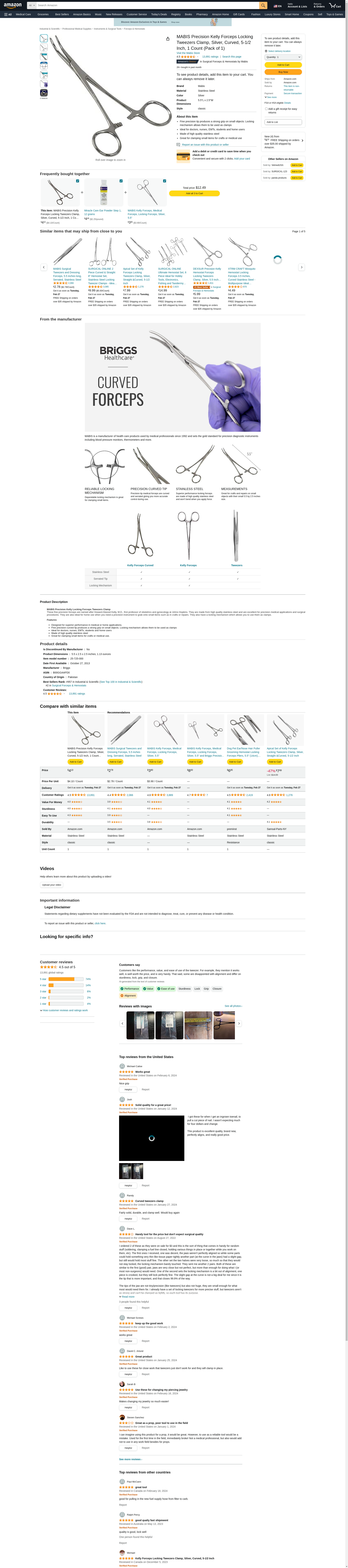 | Feature | Price For: Each Material: Stainless Steel Item: Kelly Forceps Color: Silver Length: 5-1/2" Disposable: No Blade End Style: Curved Handle Type: Box Lock Country of Origin (subject to change): Multiple |