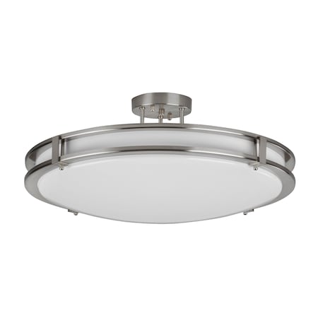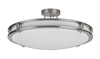 - Modern LED semi- flush mount with metal trim bands.