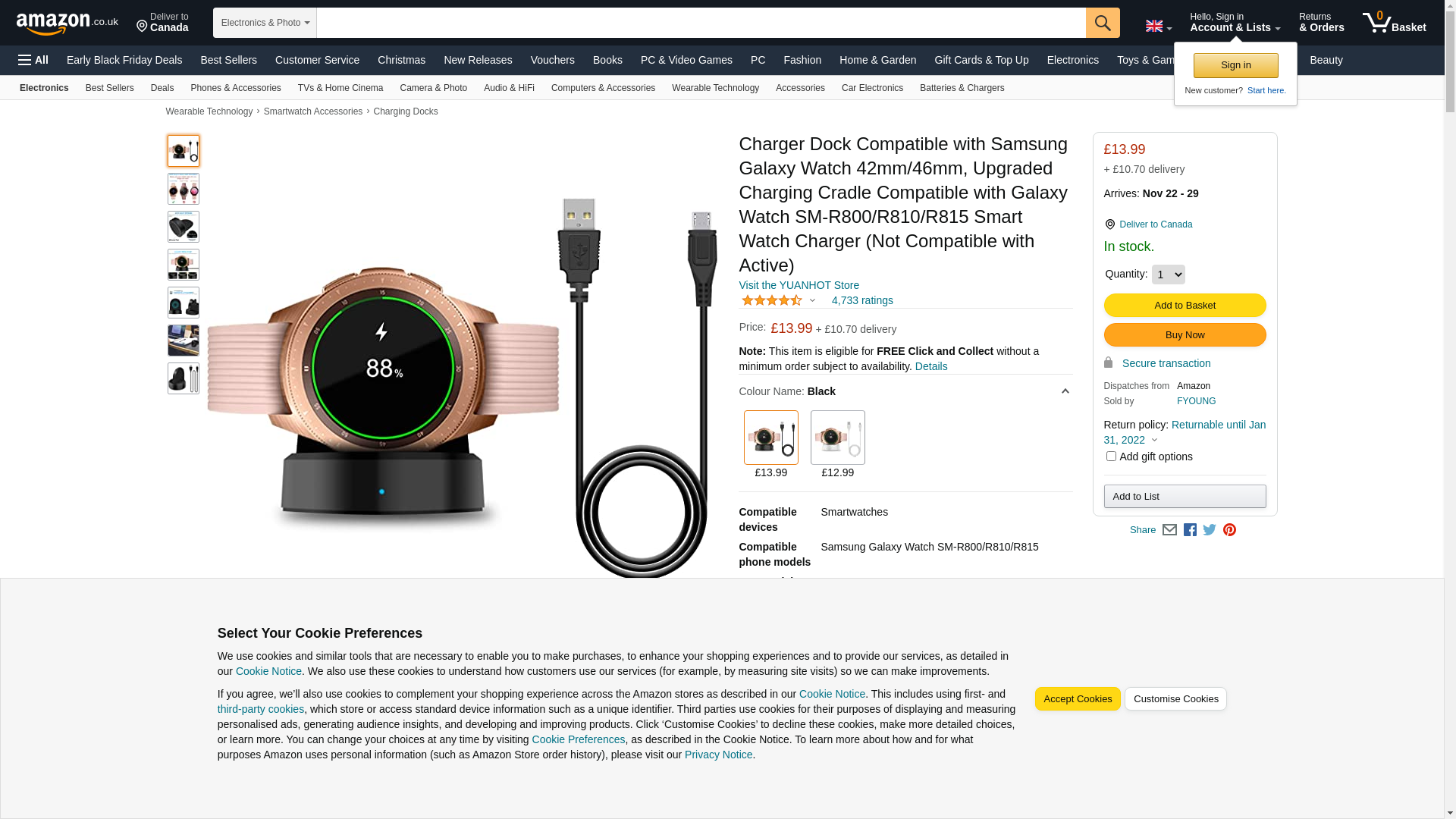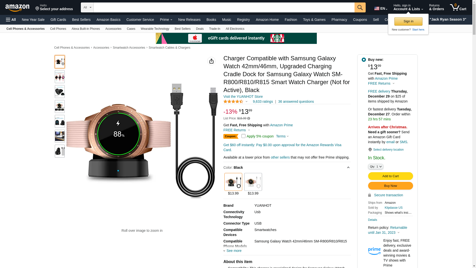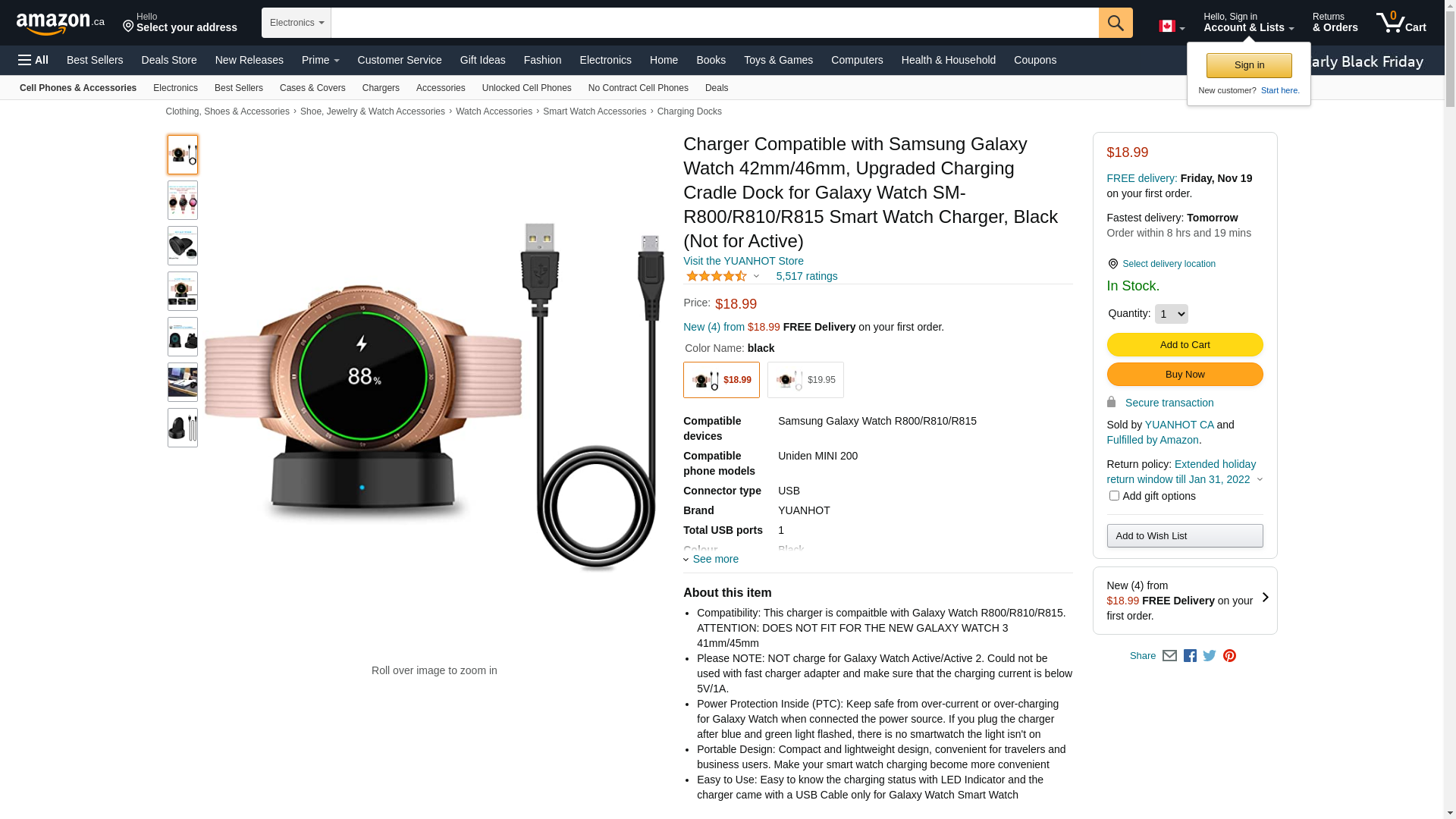 Compatible With:</br>for Samsung Galaxy Watch R800/R810/R815. With a charging cable.</br></br>Features:</br>1. Compact and lightweight design: Convenient for travelers and business users.</br>2. Power protection: Protect your smart watch from being over charged.</br>3. Specialized: Special design for Samsung Galaxy Watch SM-R800/ SM-R810/ SM-R815.</br>4. Convenient: Long cable makes your smart watch charging more convenient.</br></br>Specifications:</br>Type: Charging Cradle</br>Material: PC + ABS plastic</br>Color: black</br>Dimension: 4.6x 5.4cm (Dia * H)</br>Input voltage/current: DC 5V / 0.7A</br>Output voltage/current: DC 5V / 0.5A</br>Working distance: 4-8mm</br>Charging Efficiency: Over 70%</br></br>Package includes:</br>1 x Charging Dock</br>1 x Micro USB Cable</br></br>NOTE:It’s a normal phenomenon that the charger may get warm while charging, please unplug the charger after charging.</br>DO NOT plug the charging cable into a wall Charger with a current higher than 1A directly, as there is a risk of burning the smartwatch. We suggest that you charge your dock through computer USB port.