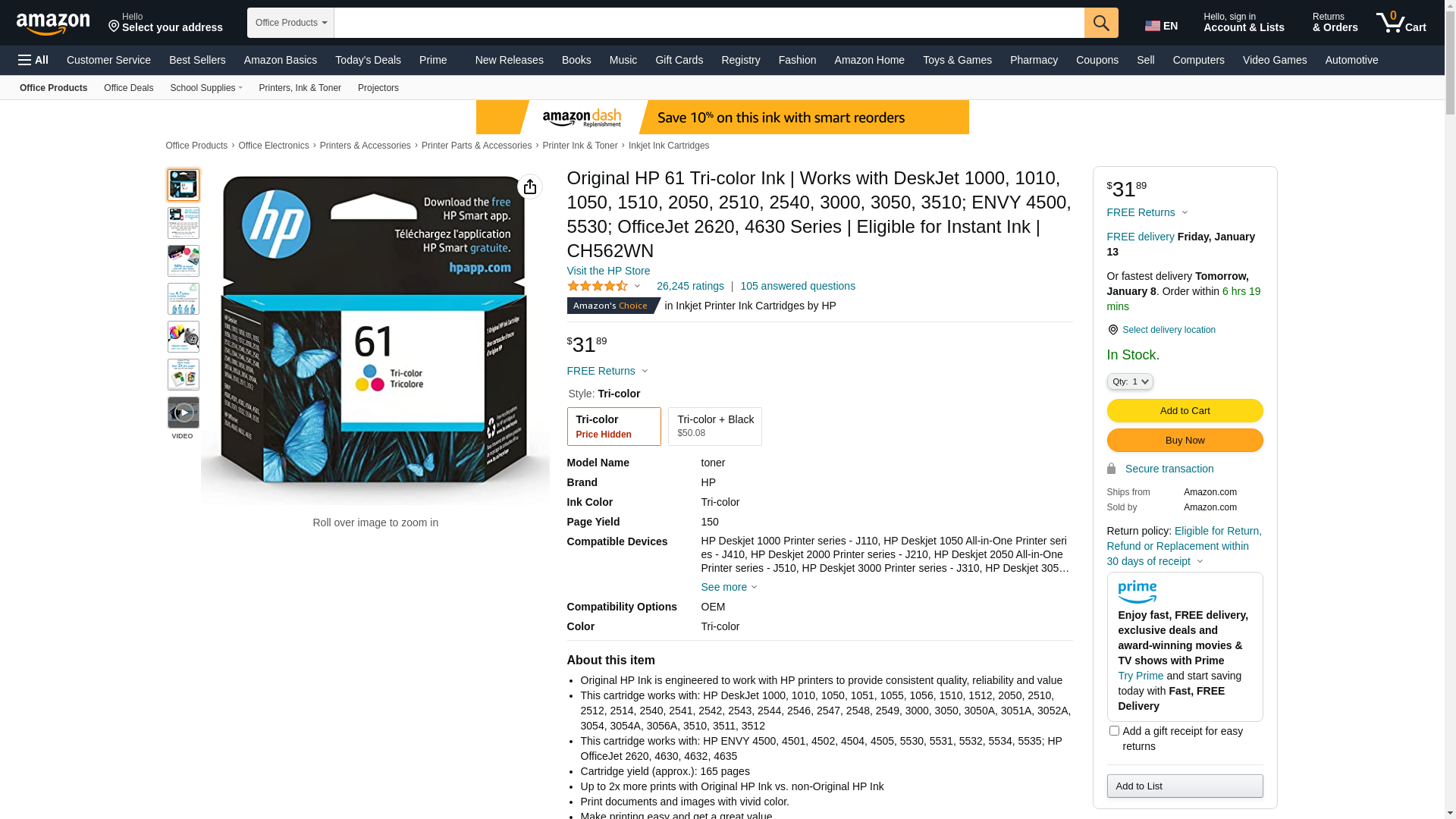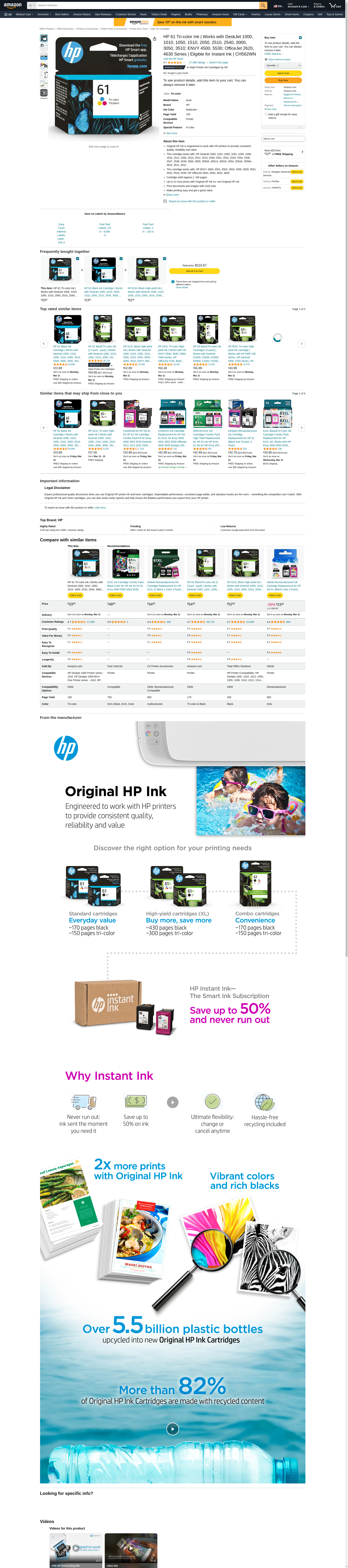 HP 61 Tri-color Ink | Works with DeskJet 1000, 1010, 1050, 1510, 2050, 2510, 2540, 3000, 3050, 3510; ENVY 4500, 5530; OfficeJet 2620, 4630 Series | Eligible for Instant Ink | CH562WN