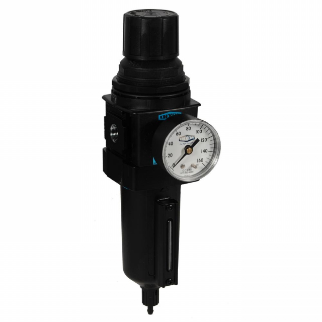 <p><strong>Applications</strong></p><ul><li>Over-under units are space savers and provide for installation in tight areas.</li><li>One common inlet/outlet for both filter and regulator saves on piping costs.</li></ul><p><strong>Use</strong></p><ul><li>To increase regulated pressure, pull adjusting knob and turn clockwise. To reduce pressure, turn knob counter clockwise. To lock knob, push down.</li></ul><p><strong>Features</strong></p><ul><li>Manual Drain</li><li>Metal Bowl with Sight Glass</li><li>10 - 250 PSIG adjusting range</li><li>5 micron element</li><li>6 oz. bowl</li><li>Self-relieving standard</li><li>Spring-loaded diaphragm</li><li>Two 1/4" gauge ports located on the front and rear faces of the body. These ports may be used as additional regulated ports or for pressure gauges. Plug unused port(s).</li><li>Supplied with a GC230 gauge</li><li>Supplied with a GC230 gauge</li></ul><p><strong>Safety notes</strong></p><ul><li>FRL's are designed for air service only, unless otherwise indicated.</li><li>SCFM ratings at 100 PSIG inlet pressure</li></ul>