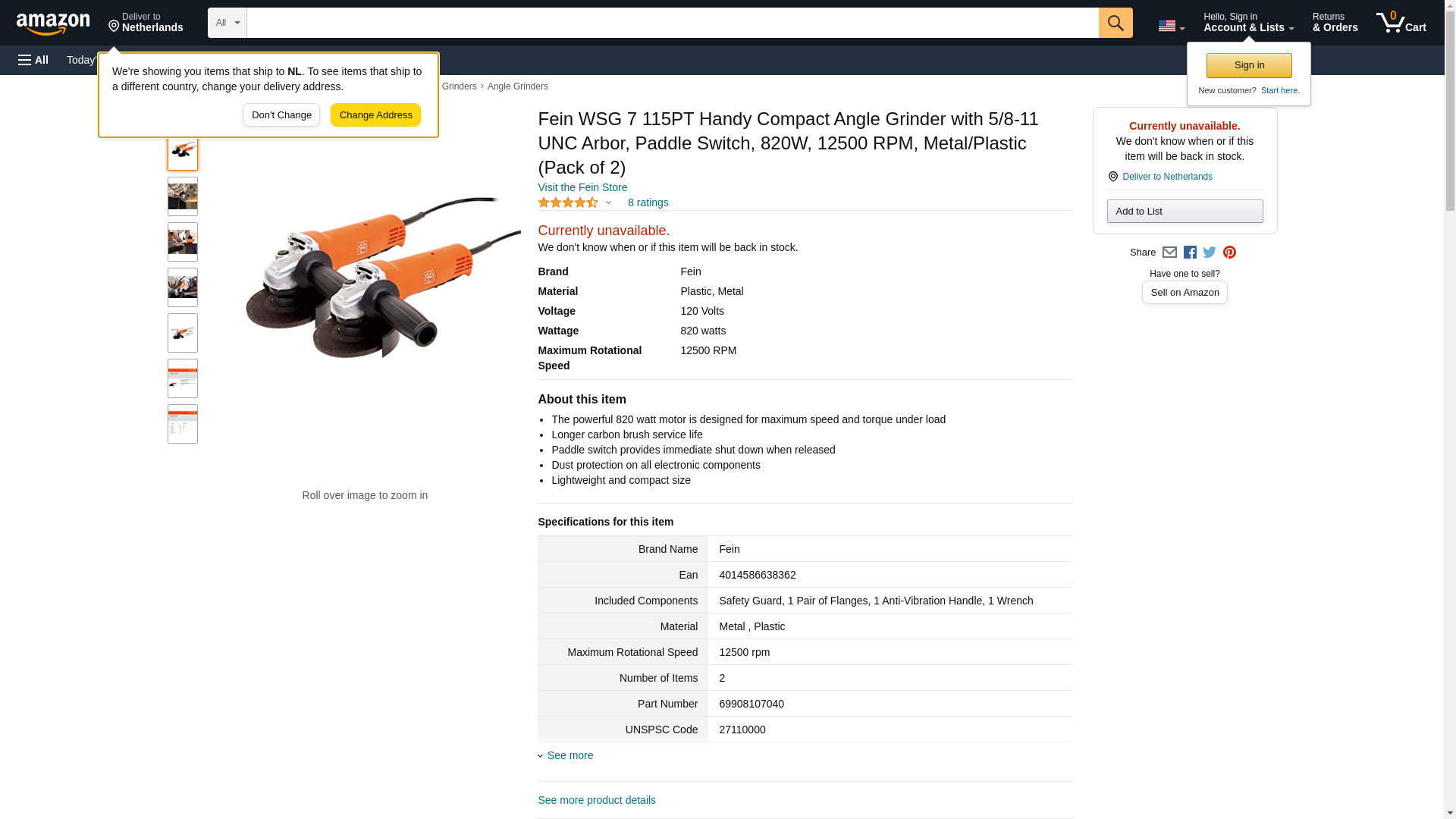 Fein WSG 7 115PT Handy Compact Angle Grinder with 5/8-11 UNC Arbor, Paddle Switch, 820W, 12500 RPM, Metal/Plastic (Pack of 2)