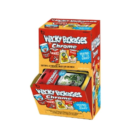 Wacky Packages Chrome merges the classic Wacky Packages style cards with a premium metallic look and boasts a large variety of refractors, increasing collectability. Wacky Packages has been providing hilarious product parody stickers for more than 40 years. With a timeless sense of humor, Wacky Packages pokes fun at consumerism and favorite brands. Each card is hand painted giving it a unique look which fans love. Each pack contains 4 cards. Insert or parallel replaces base card.