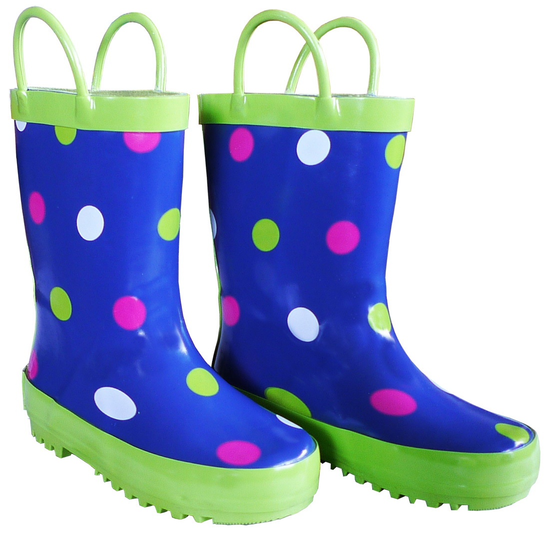 Foxfire for Kids navy rubber boots have a green trim, sole and handles. The polka dots are green, pink and white. These boots have handle to make it easy for the little one to pull their boots on. The boots have a soft cotton lining and non slip soles.