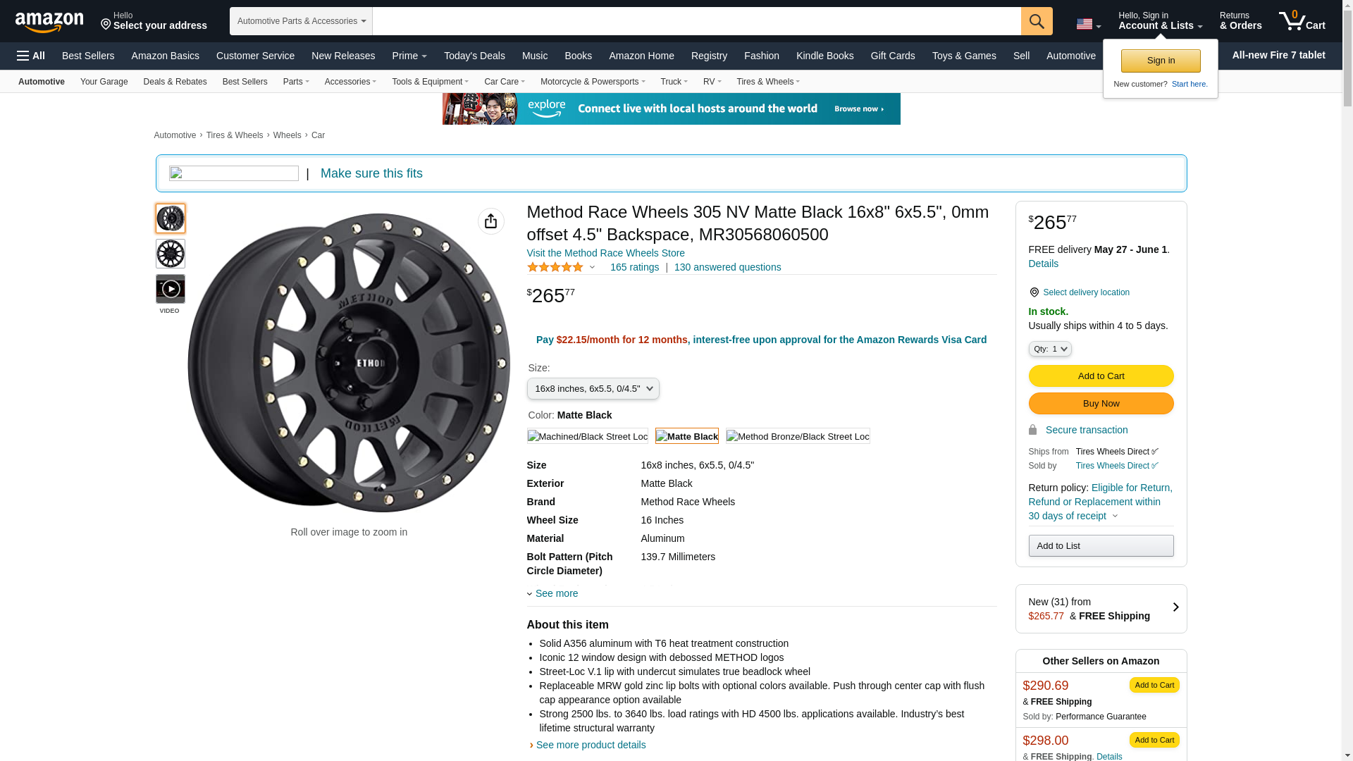 Method Race Wheels 305 NV Matte Black 16x8" 6x5.5", 0mm offset 4.5" Backspace, MR30568060500